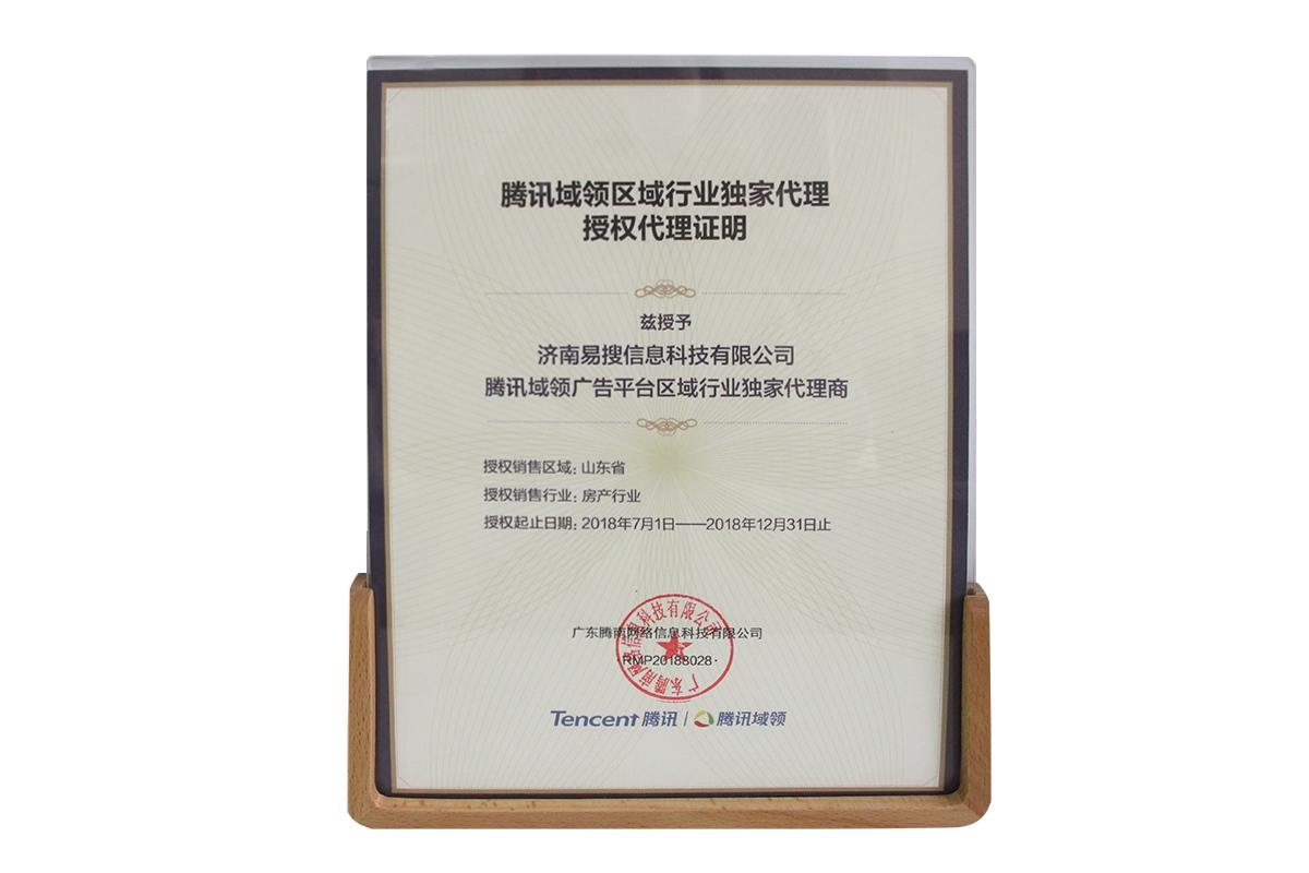 18年騰訊域領區(qū)域行業(yè)獨家代理授權代理證明