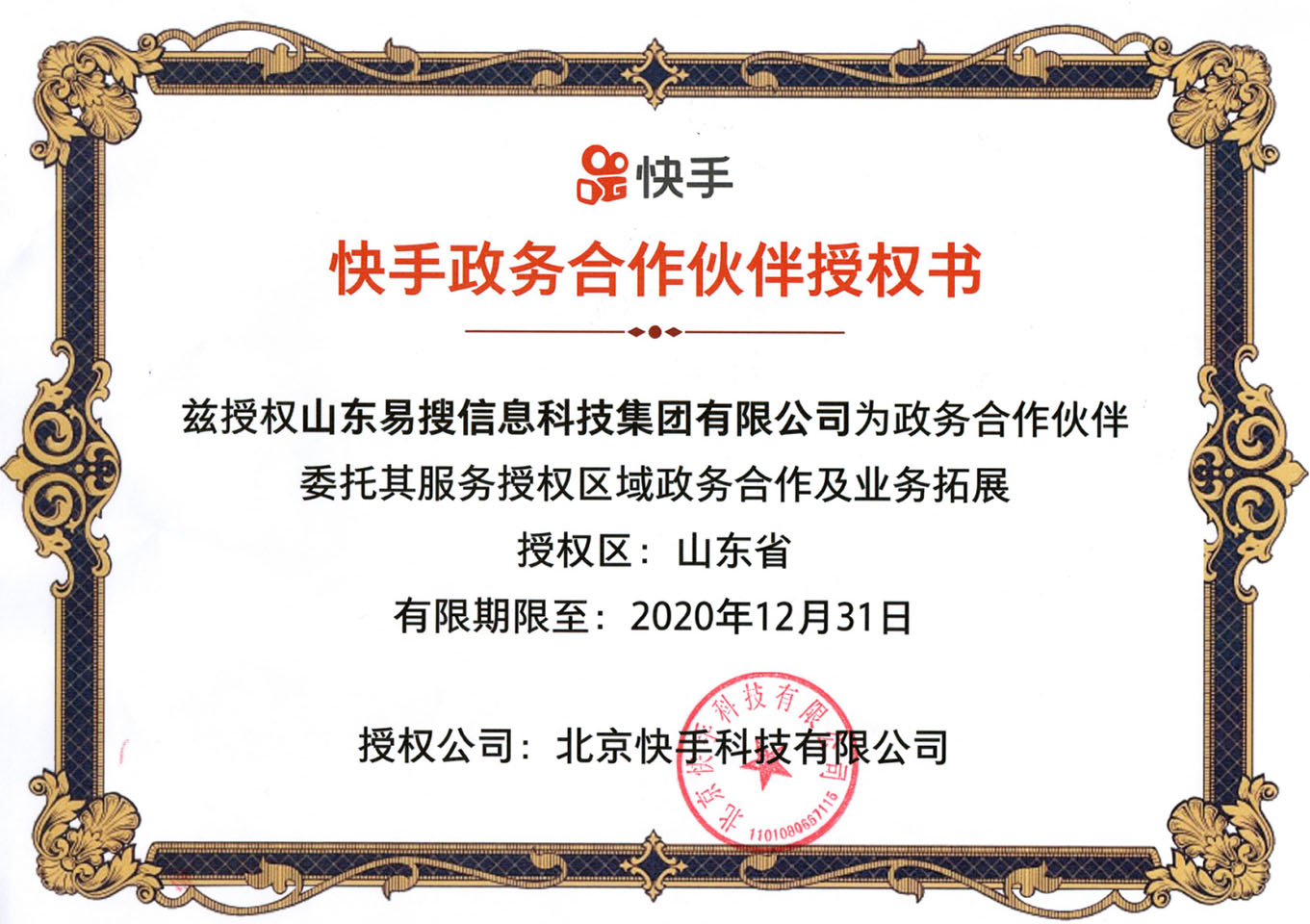 快手政務合作伙伴授權書