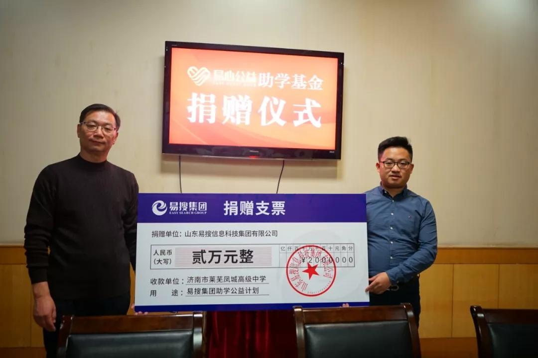 百年大業(yè),教育為本。易搜集團董事長李偉心作為中國民主同盟會新盟員,積極響應民盟山東省委全力踐行社會責任的號召,建立“易心公益助學基金”。自基金成立之日起,易搜集團每年向萊蕪鳳城高級中學捐款兩萬元,將連續(xù)捐助十年,總計金額二十萬。旨在獎勵考上清華北大的優(yōu)秀學生,和為莘莘學子默默付出,奮斗在教學一線的優(yōu)秀教師。李偉心表示,希望通過此次公益活動能夠呼吁更多青年企業(yè)家、學校校友關注教育事業(yè),注重企業(yè)發(fā)展的同時積極承擔社會責任。